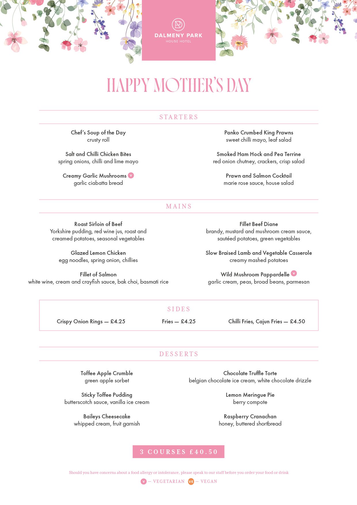 The most amazing women in your life deserve the best. Treat her this Mother’s day to a delicious 3 course meal, she really deserves it from £40.50 per person.
